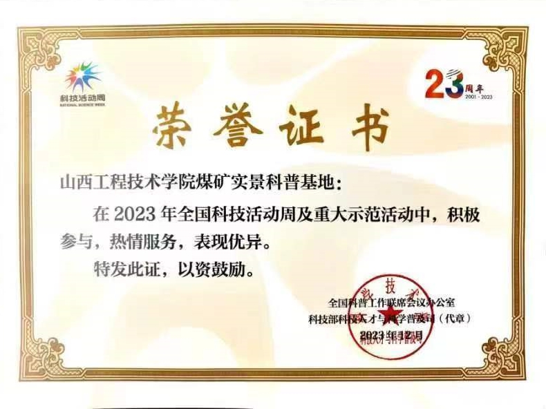 近日,全国科普工作联席会议办公室、科技部科技人才与科学普及司对2023年全国科技活动周及重大示范活动中表现优异的科普基地予以表彰,学院煤矿实景科普基地积极参与活动,热情服务,获得本次表彰。煤矿实景科普基地是山西省科技厅、科学技术协会认定的省级科普基地,是中国煤炭学会批准认定的“中国煤炭行业A类科普教育基地”,持续面向企事业单位职工、大中小学与幼儿园学生、社区群众开展科普教育活动,对提高地方民众对煤炭产业科技的认知、传承弘扬煤炭精神起到积极作用。