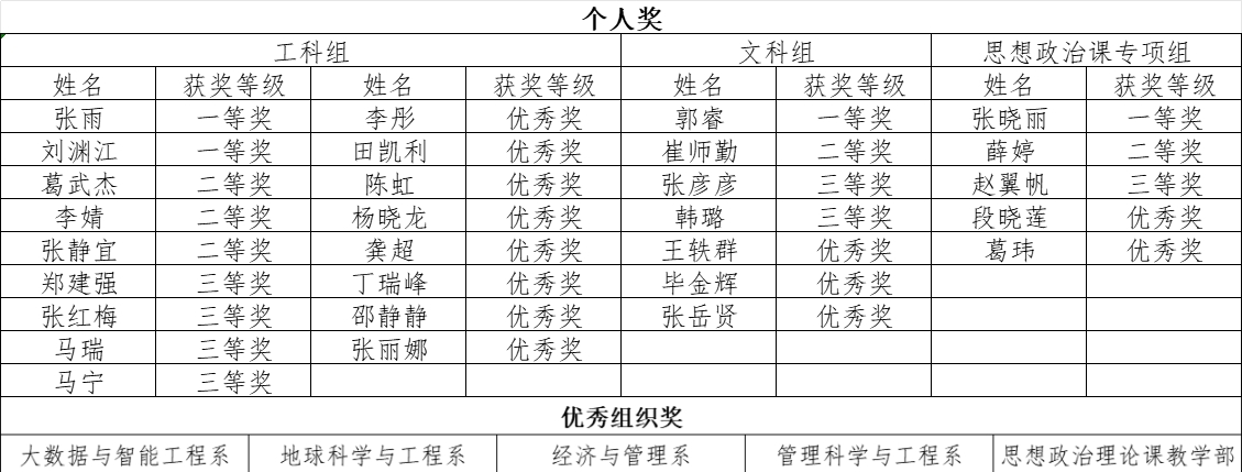 此次竞赛,全院共有105名青年教师参加初赛,经选拔,来自13个系部的29名选手晋级校赛。经过激烈角逐,组委会审核并公示,大赛共评选出个人奖29项:一等奖4名、二等奖5名、三等奖7名、优秀奖13名以及优秀组织单位5个,拟推荐刘渊江、郭睿和张晓丽3名教师参加省级比赛。