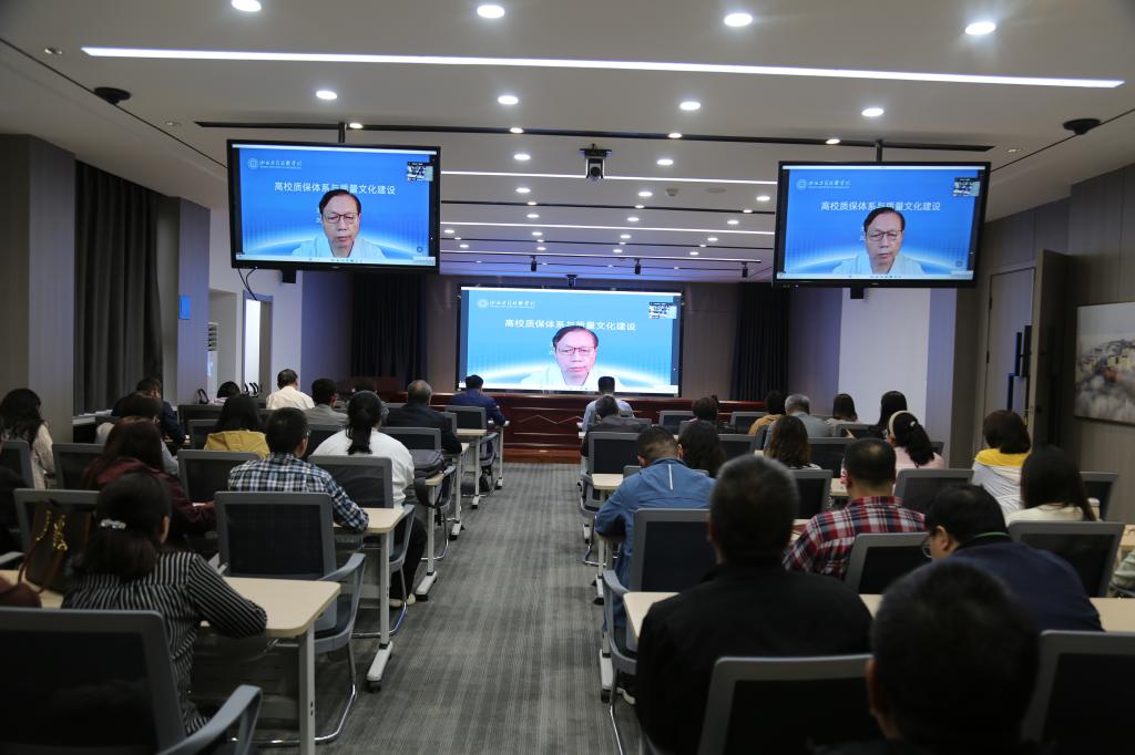 会上,张安富教授以“高校质保体系与质量文化建设”为主题,从质保体系建设的应然要求、质保体系的构成要素与建构、质量文化建设的核心意蕴、质量文化建设的核心意蕴、质量文化建设的实践路径四个方面,详细介绍了高校质保体系的演变情况,深入阐释了高校质保体系建构的理论遵循和基本思路,深刻解读了质保体系的六大子系统、运行机制,从物质层、行为层、制度层、精神层深刻解读了质量文化,提供了学术、器物、制度、行为、精神五种质量文化建设的实践路径和策略。