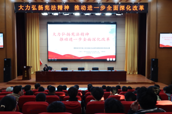 为全面贯彻落实党的二十大和党的二十届三中全会精神,深入学习宣传贯彻习近平法治思想,弘扬宪法精神,维护宪法权威,推动宪法教育入脑入心入行,12月4日,我国第十一个国家宪法日到来之际,学院联合阳泉市中级人民法院在行知楼一层报告厅举行了主题为“大力弘扬宪法精神推动进一步全面深化改革”国家宪法日专题宣讲活动。活动邀请阳泉市中级人民法院刑二庭法官助理杨佼佼担任主讲,学院师生共300余人现场学习宪法知识,体悟宪法精神,增强宪法自觉。活动由学院团委副书记张瑶主持。
