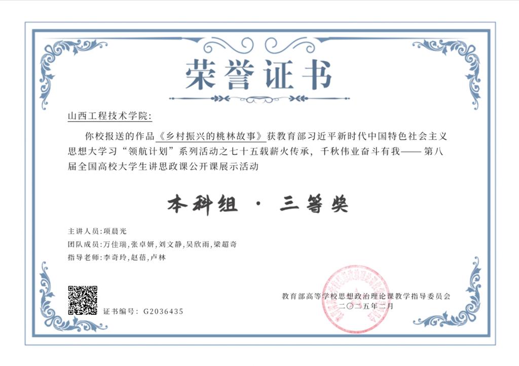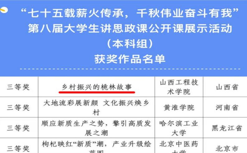 近日,在“七十五载薪火传承,千秋伟业奋斗有我”第八届全国高校大学生讲思政课公开课展示活动(本科组)中,学院推荐的《乡村振兴的桃林故事》作品在全国1339所高校提交的5007部作品中脱颖而出,荣获三等奖。