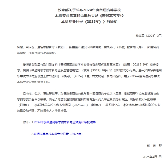 近日,教育部下发《教育部关于公布2024年度普通高等学校本科专业备案和审批结果及〈普通高等学校本科专业目录(2025年)〉的通知》(教高函〔2025〕3号),公布了2024年度高等学校本科专业备案和审批结果。学院申报的智能建造、能源化学工程两个本科专业成功获批,并将于今年9月开始招生。