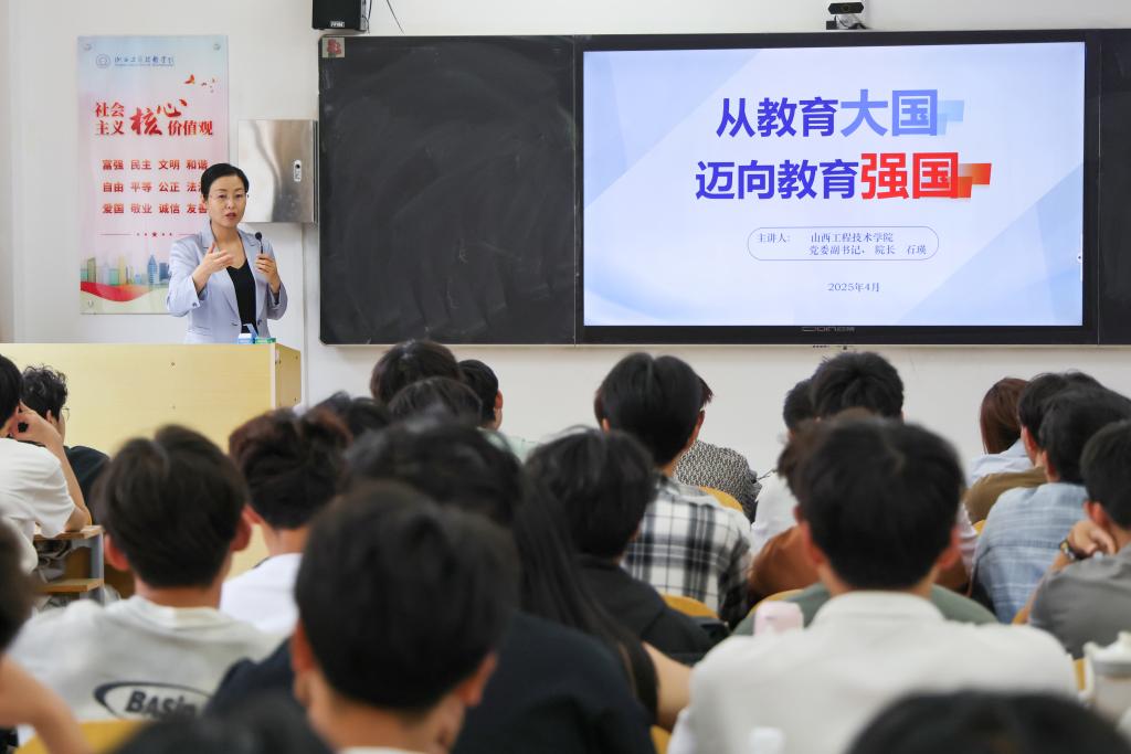 5月22日,党委副书记、院长石瑛为24级工程造价本科1、2班89名学生,讲授以“从教育大国迈向教育强国”为题的形势与政策课程。