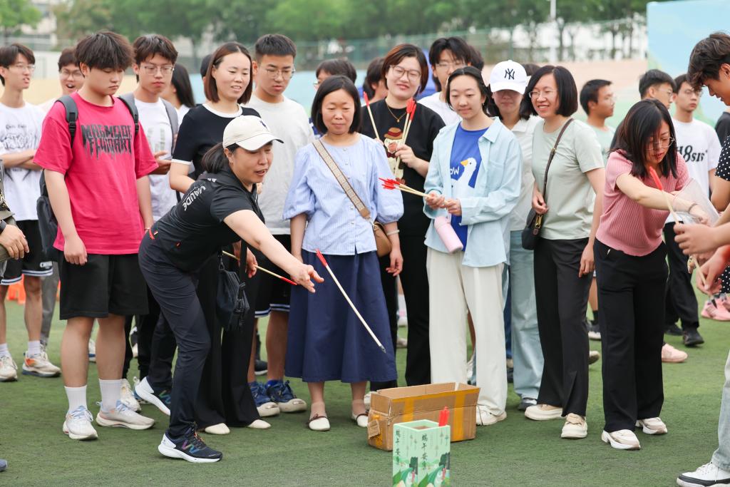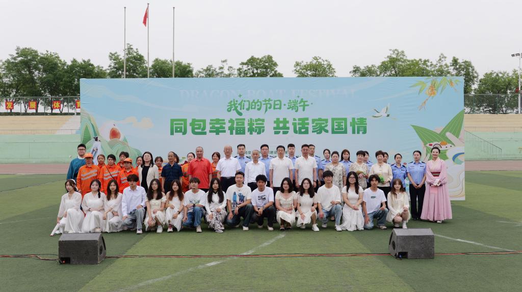 在“千人共包‘幸福粽’”环节,在场人员们纷纷大展身手,绳线缠绕间,一个个甜美的粽子便呈现在眼前。填糯米、裹红枣、系彩绳,师生们在一招一式中体悟匠心;掷沙包、投壶、套粽子等多个趣味游戏愉悦身心的同时令人流连忘返。此外,现场还设置了“粽叶门帘”“龙舟背景板”等主题拍照点,师生们纷纷驻足打卡,定格端午印象。
