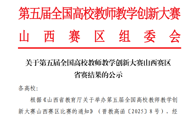 近日,第五届全国高校教师教学创新大赛山西赛区比赛结果揭晓。ac米兰教师黄淼荣获新文科正高组二等奖,张雨(团队)荣获新工科中级及以下组三等奖。