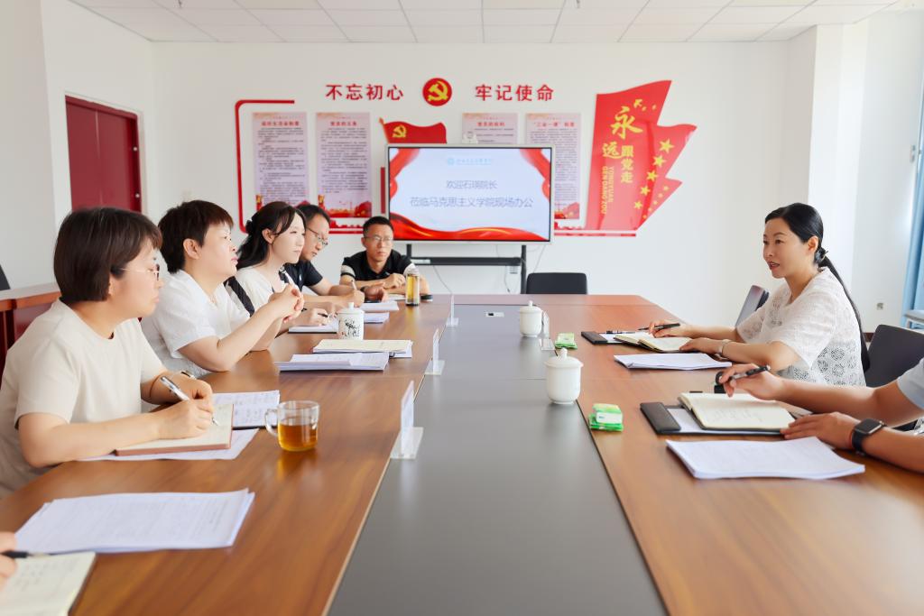 6月27日,党委副书记、院长石瑛到马克思主义学院召开现场办公会,深入了解马克思主义学院建设发展现状,进一步强化思想政治教育工作,推动马克思主义学院高质量发展。马克思主义学院各党支部书记、教研室主任、博士、教师代表等参加了现场办公会。马克思主义学院党总支书记、院长史美青主持会议。