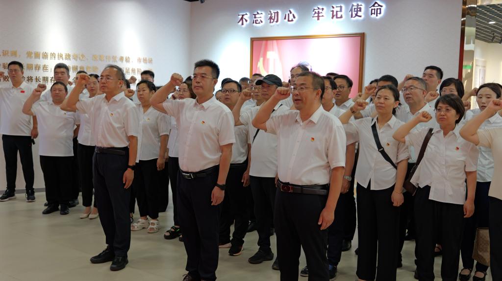 在宣誓厅,全体人员举起右拳,重温入党誓词,坚守初心使命的决心和忠诚履职尽责的恒心凝聚在铿锵有力的宣誓声中。