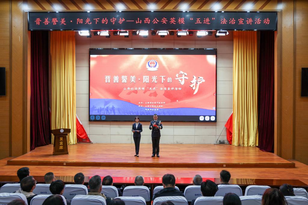 为进一步深化法治宣传教育,在青年学子心中播撒法治种子,11月3日下午,“晋善警美·阳光下的守护”山西公安英模“五进”法治宣讲活动(阳泉专场)在学院行知楼一层报告厅举行。学院党委委员、副院长穆满根,阳泉市公安局党委委员、政治部主任李武等与学院近500名师生代表共赴一场法治与青春的约会,开启法治与青春的深度对话。