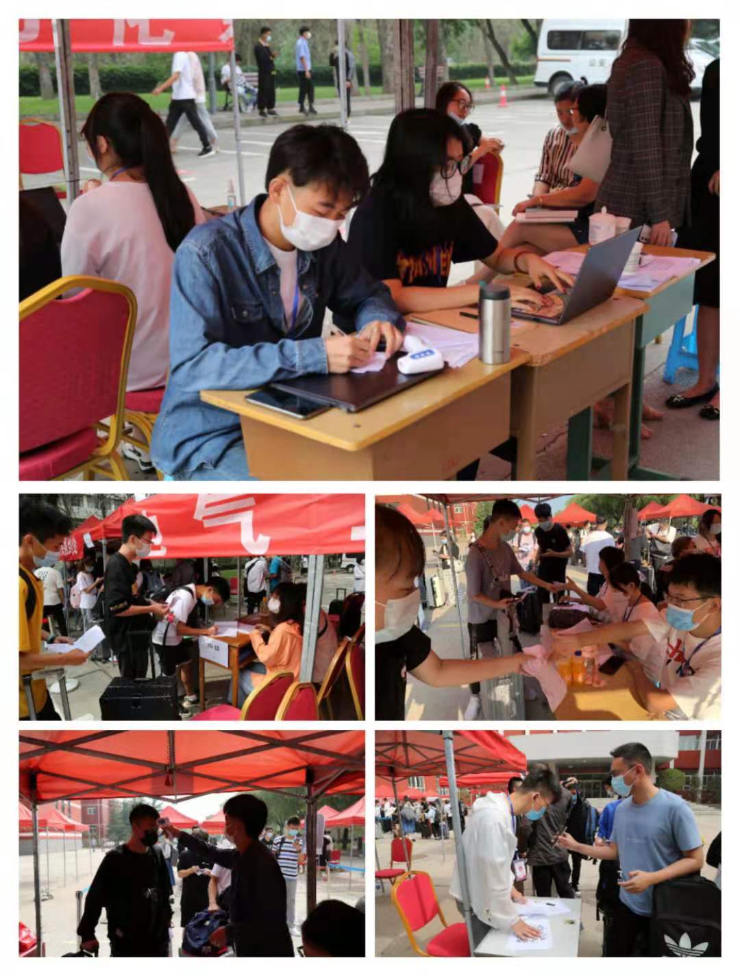 进入校园后,学生在各系部接待处有序排队、测温、扫码、登记工作。