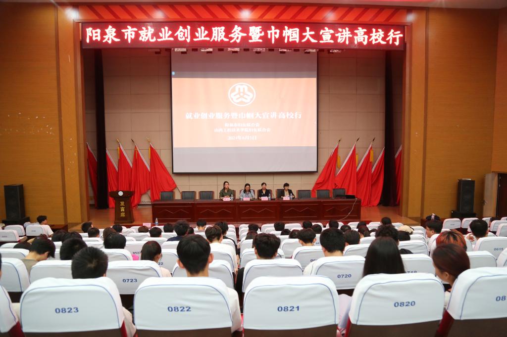 为拓展学生就业创业思维、帮助学生树立正确的就业创业观、激励学生积极投身创业就业浪潮,6月5日,学院妇联、招生就业部联合阳泉市妇联在学院行知楼报告厅成功举办就业创业服务暨巾帼大宣讲活动。学院党委委员、副院长、妇联主席王建梅,市政府妇儿工委办主任王文华、市妇联发展部部长王静静出席活动,学院妇联副主席李海珍,学生工作部部长、妇联副主席马秀叶与学院500多名学生参与活动共同参加活动,活动由王建梅主持。