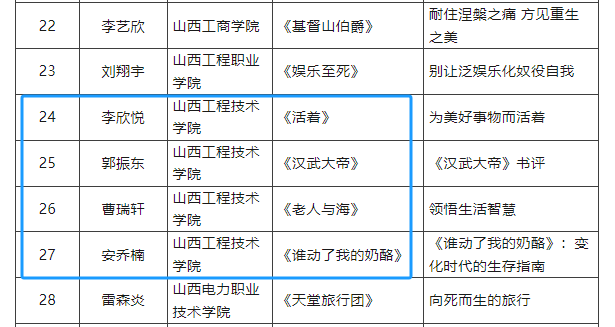 历经四个多月的征集与评选,由山西省高校图工委主办的面向全省大学生的2024年“超星杯”山西省高校大学生书评大赛近日落下帷幕,此次大赛共有49家高校提交作品7744篇,学院图书馆荣获“优秀组织奖”,李欣悦、郭振东等4名同学获“个人二等奖”。
