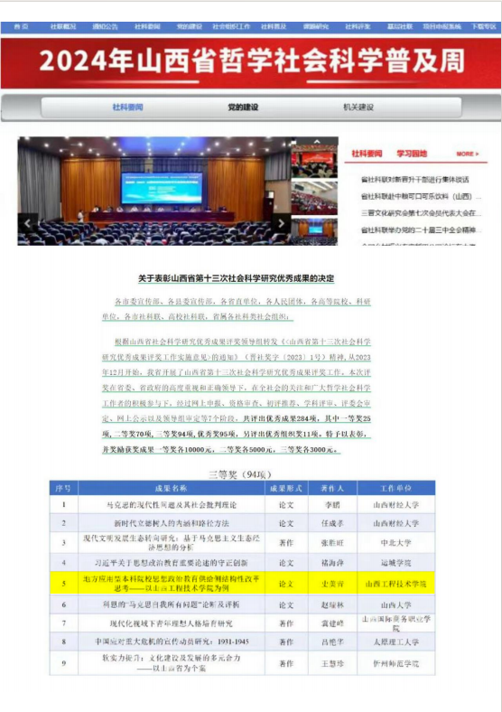9月5日, 山西省社会科学研究优秀成果评审委员会公布山西省第十三次社会科学研究优秀成果奖评选结果。思政部史美青教授论文成果《地方应用型本科院校思想政治教育供给侧结构性改革思考——以ac米兰官方网站为例》荣获三等奖。