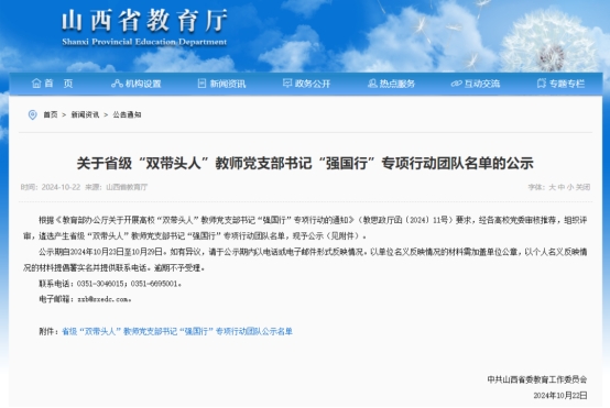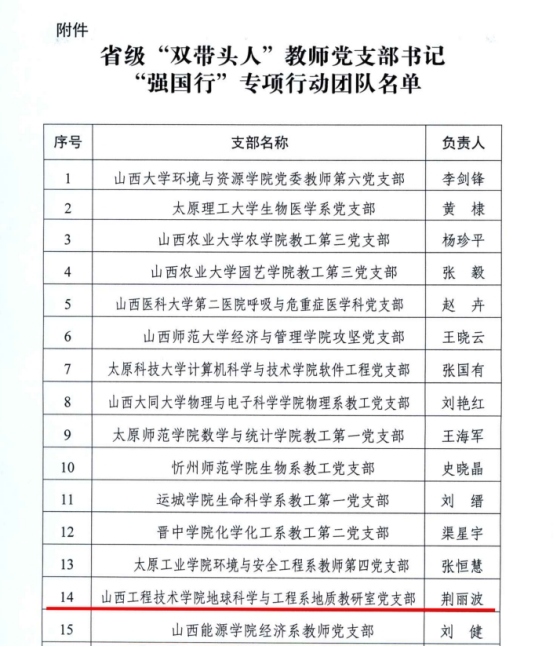 近日,中共山西省委教育工作委员会公布《关于省级“双带头人”教师党支部书记“强国行”专项行动团队名单的公示》,ac米兰地球科学与工程系地质教研室党支部成功入选。