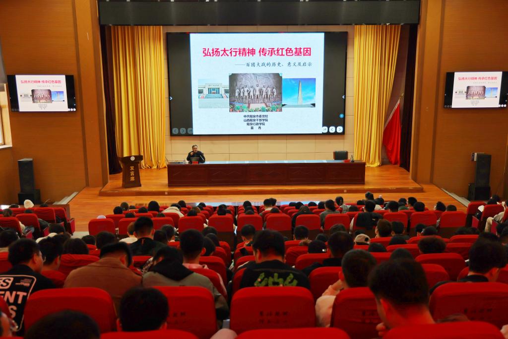 本次宣讲会邀请了中共阳泉市委党校教师、马克思主义教研室副主任苗青作题为“弘扬太行精神 传承红色基因——百团大战的历史、意义及启示”专题讲座。“百团大战所体现的红色精神是我们宝贵的精神财富,启示我们要继承革命先辈光荣传统、传承伟大的民族精神”,苗青结合翔实的史料、丰富的数据和珍贵的历史图片,围绕“百团大战”发生的历史背景、战役经过、重大意义及当代启示四方面内容展开详细讲解,深刻阐释了“不怕牺牲、不畏艰险;百折不挠、艰苦奋斗;万众一心、敢于胜利;英勇奋斗、无私奉献”的太行精神内涵与时代价值,带领师生们共同回溯了中国共产党领导的这场在中国革命和抗战历史上具有重要的意义的战役,共同感受了革命先辈顽强斗争、浴血奋战、对党忠诚的崇高精神。