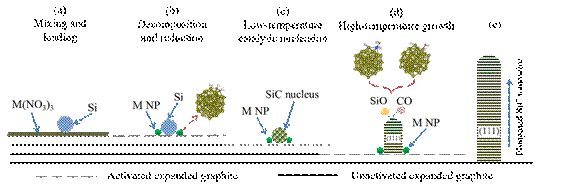 过渡金属纳米颗粒催化膨胀石墨与Si反应生成SiC晶须催化机理示意图