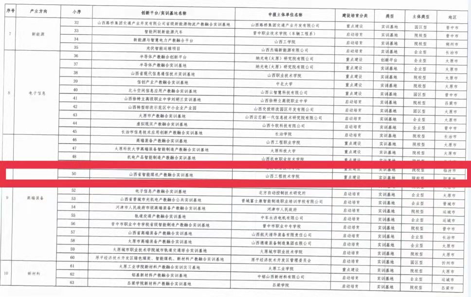 经基础资料初审、答辩评审、实地考察、联席审核、社会公示等程序,ac米兰申报的“山西省智能煤机产教融合实训基地”成功入选“山西省首批产教融合重大平台载体和实训基地重点产业集群试点培育名单”,是42个重点建设项目之一。