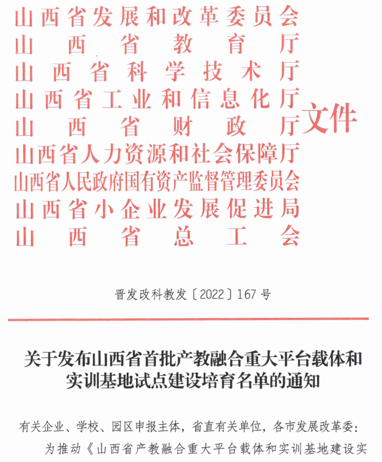 近日,山西省发改委、山西省教育厅等9部门联合印发《关于发布山西省首批产教融合重大平台载体和实训基地试点建设培育名单的通知》(晋发改科教发〔2022〕167号),ac米兰“山西省智能煤机产教融合实训基地”成功入选“高端装备”产业集群的重点建设项目。
