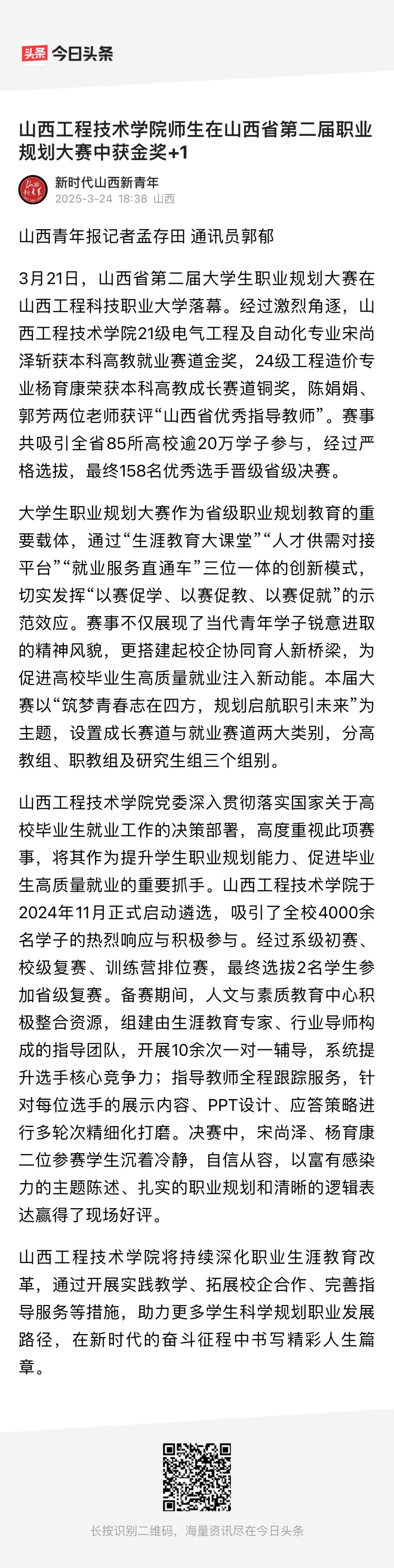 【媒体看山西工院】今日头条客户端2025年3月24日报道ac米兰:ac米兰官方网站师生在山西省第二届职业规划大赛中获金奖+1