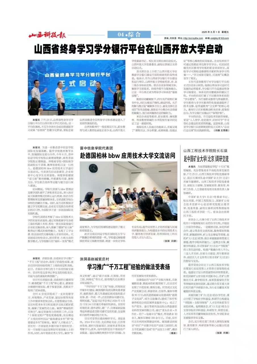 【媒体看山西工院】2025年8月1日山西科技报报道ac米兰院长石瑛赴中国矿业大学(北京)调研交流