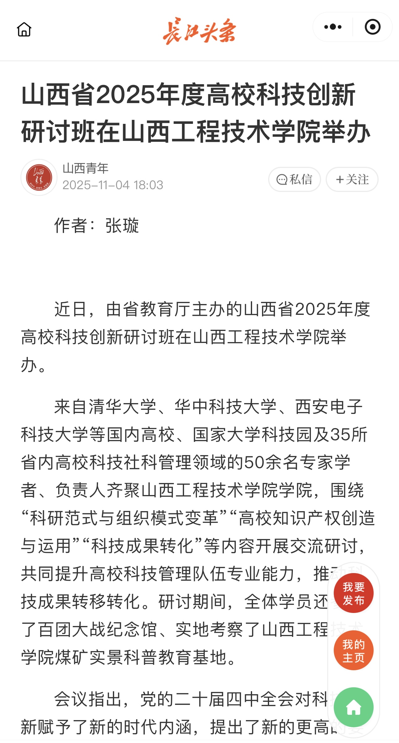 【媒体看山西工院】2025年11月4日长江头条报道ac米兰:山西省2025年度高校科技创新研讨班在ac米兰官方网站举办