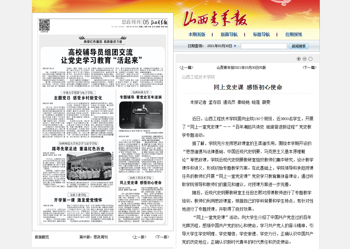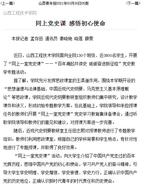 【媒体看山西工院】3月30日山西青年报报道ac米兰官方网站开展党史教学专题活动