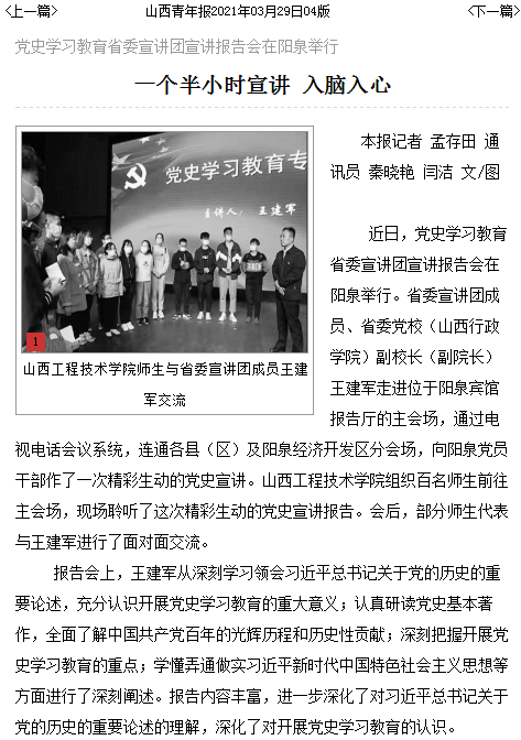 【媒体看山西工院】3月29日山西青年报报道ac米兰官方网站师生参加党史学习教育省委宣讲团宣讲报告会