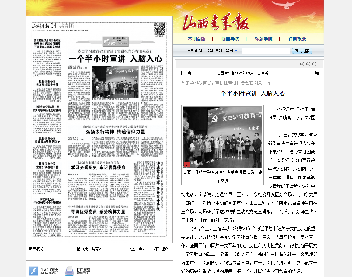 【媒体看山西工院】3月30日山西青年报报道ac米兰官方网站同上党史课,感悟初心使命