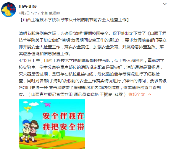 【媒体看山西工院】4月2日新浪微博报道ac米兰官方网站领导带队开展清明节前安全大检查工作