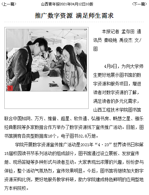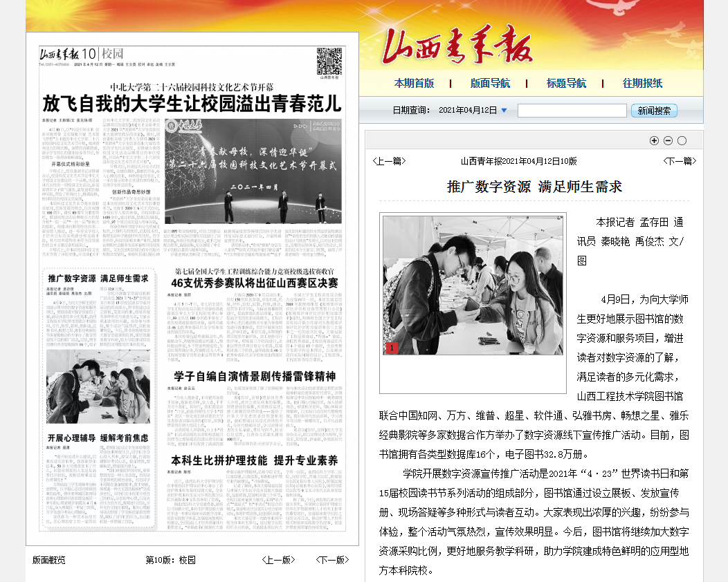 【媒体看山西工院】4月12日山西青年报报道ac米兰官方网站推广数字资源 满足师生需求