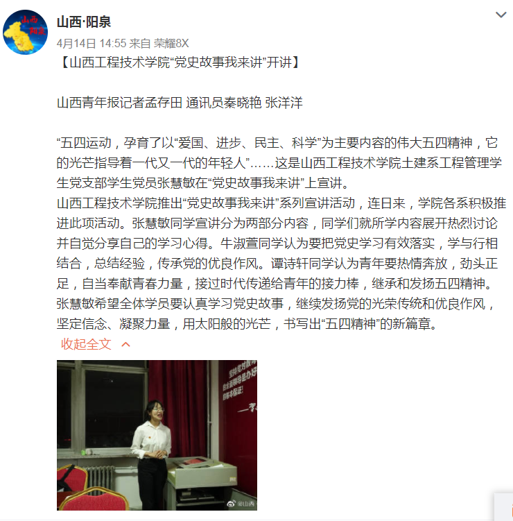 【媒体看山西工院】4月14日新浪微博报道ac米兰官方网站“党史故事我来讲”开讲