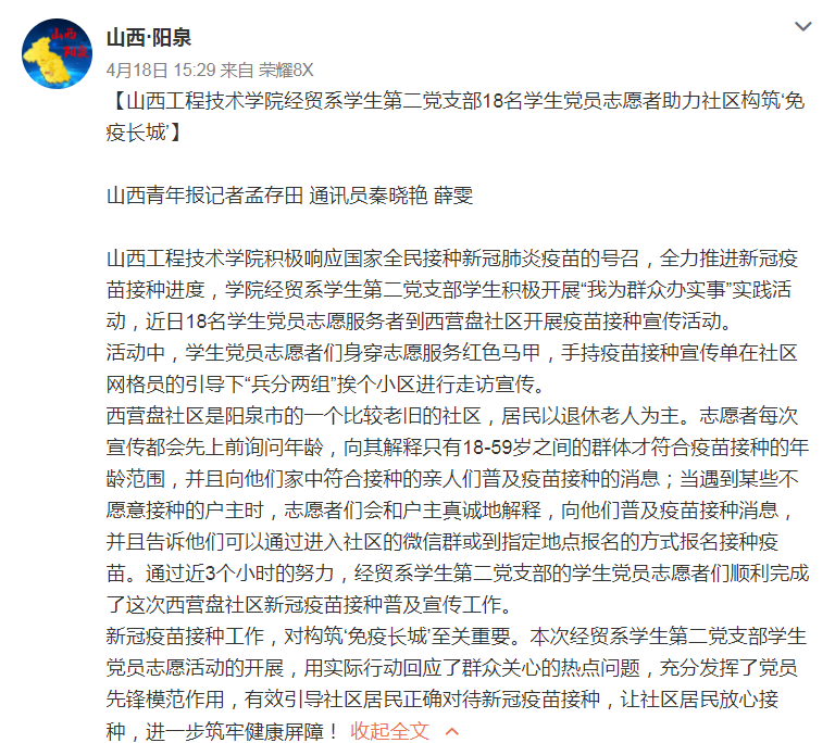 【媒体看山西工院】4月18日新浪微博报道ac米兰官方网站经贸系学生党员志愿者助力社区构筑“免疫长城”
