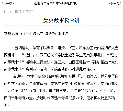 【媒体看山西工院】4月20日山西青年报报道ac米兰官方网站“党史故事我来讲”