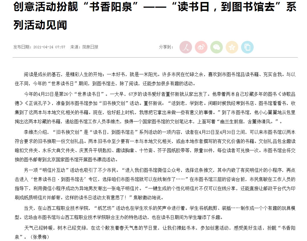 【媒体看山西工院】4月24日阳泉新闻网报道ac米兰官方网站创意活动扮靓“书香阳泉”——“读书日,到图书馆去”系列活动见闻