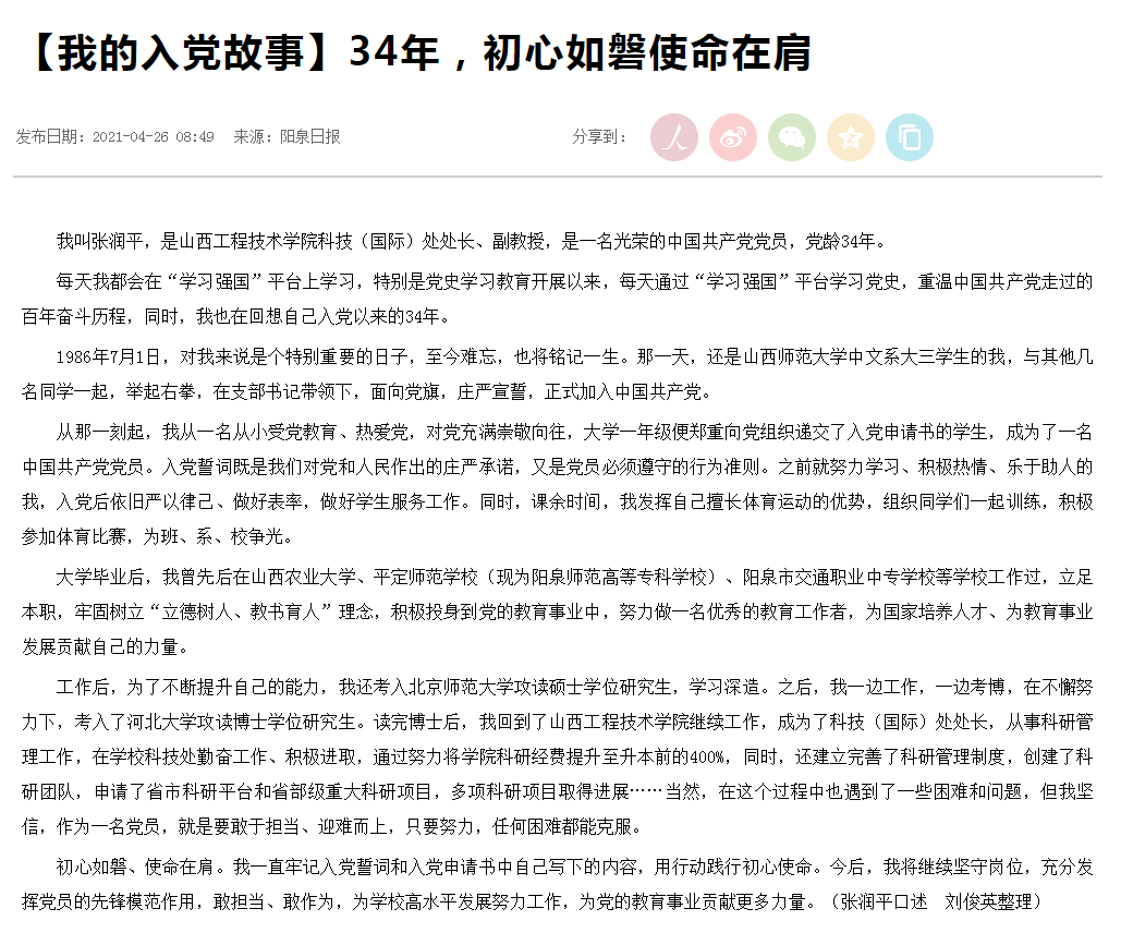 【媒体看山西工院】4月26日报道张润平入党故事:34年 初心如磐使命在肩