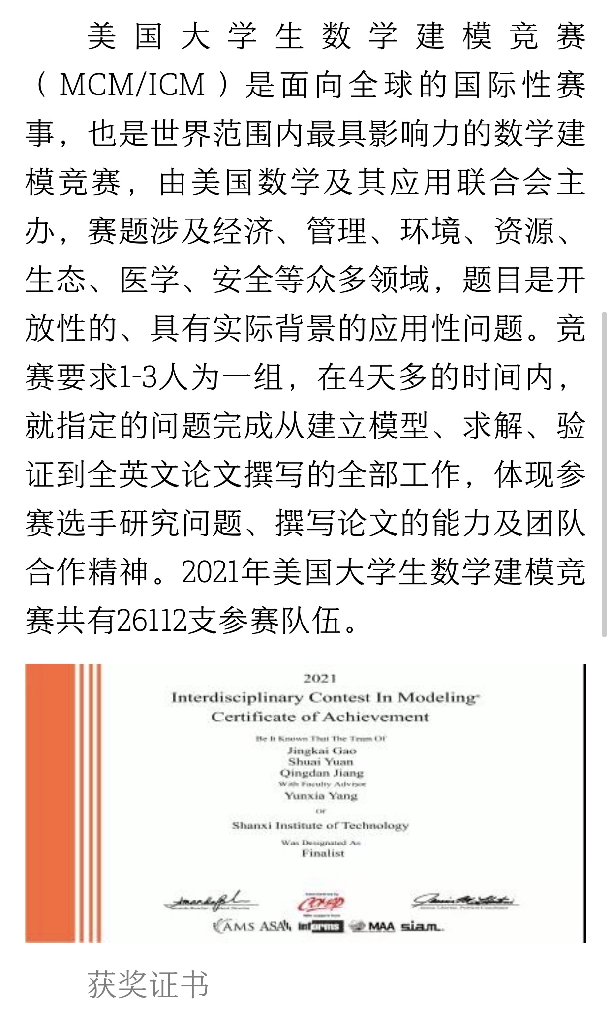 【媒体看山西工院】4月30日山西日报客户端报道山西学子获2021年美国大学生数学建模竞赛特等奖提名奖
