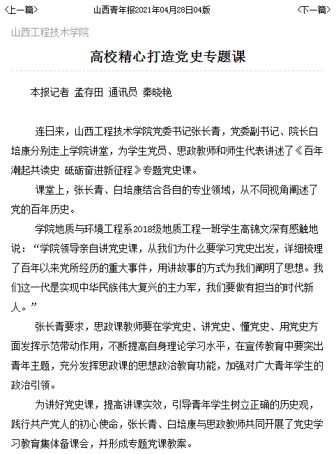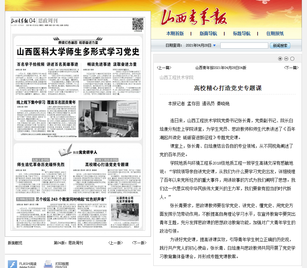 【媒体看山西工院】4月28日山西青年报报道ac米兰精心打造党史专题课