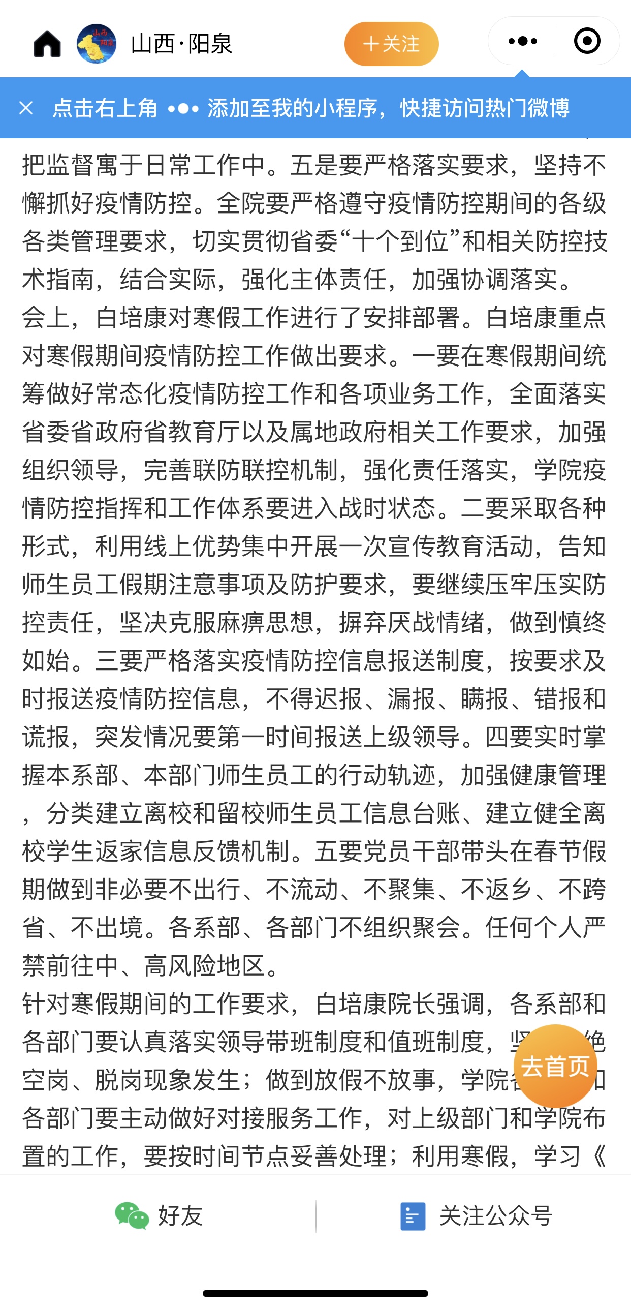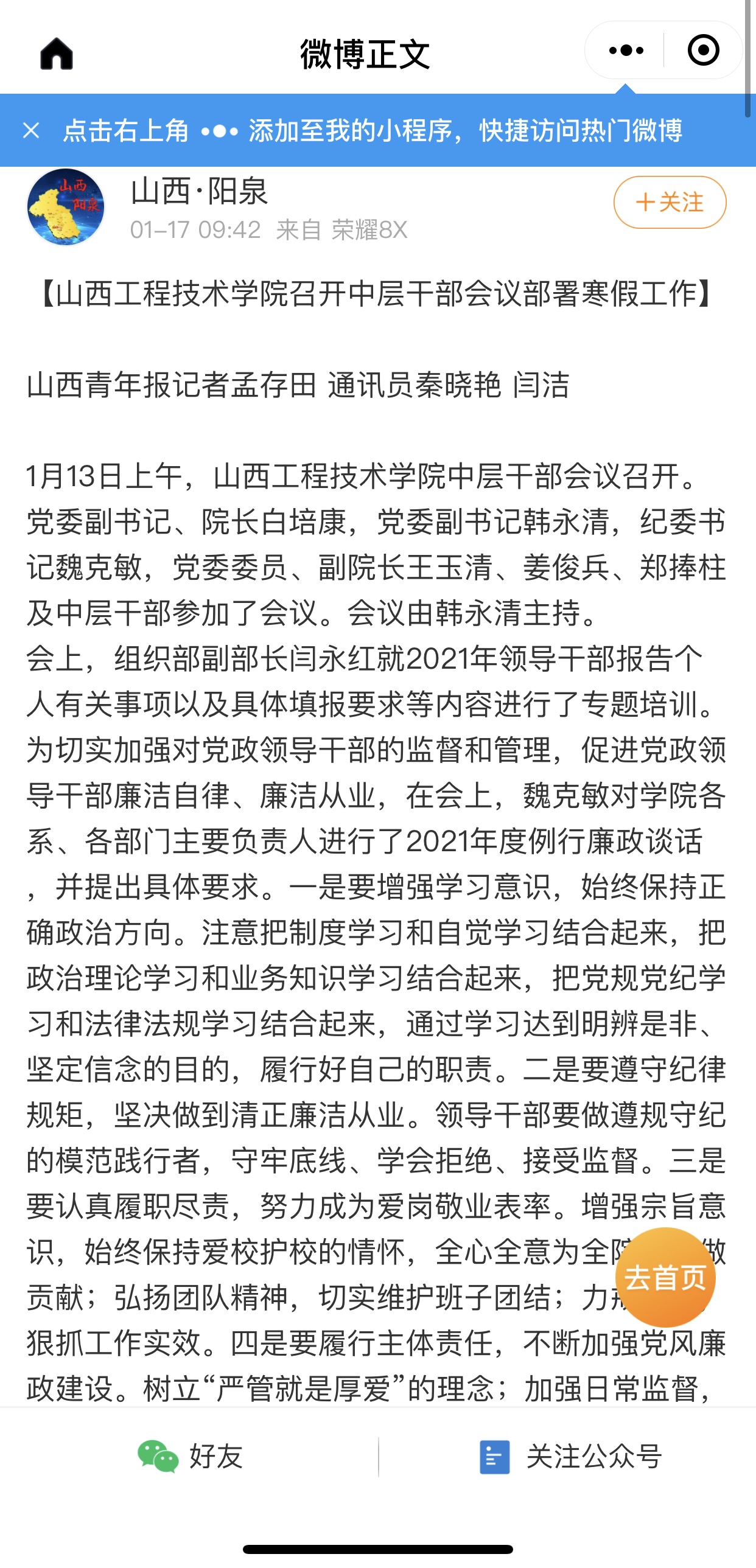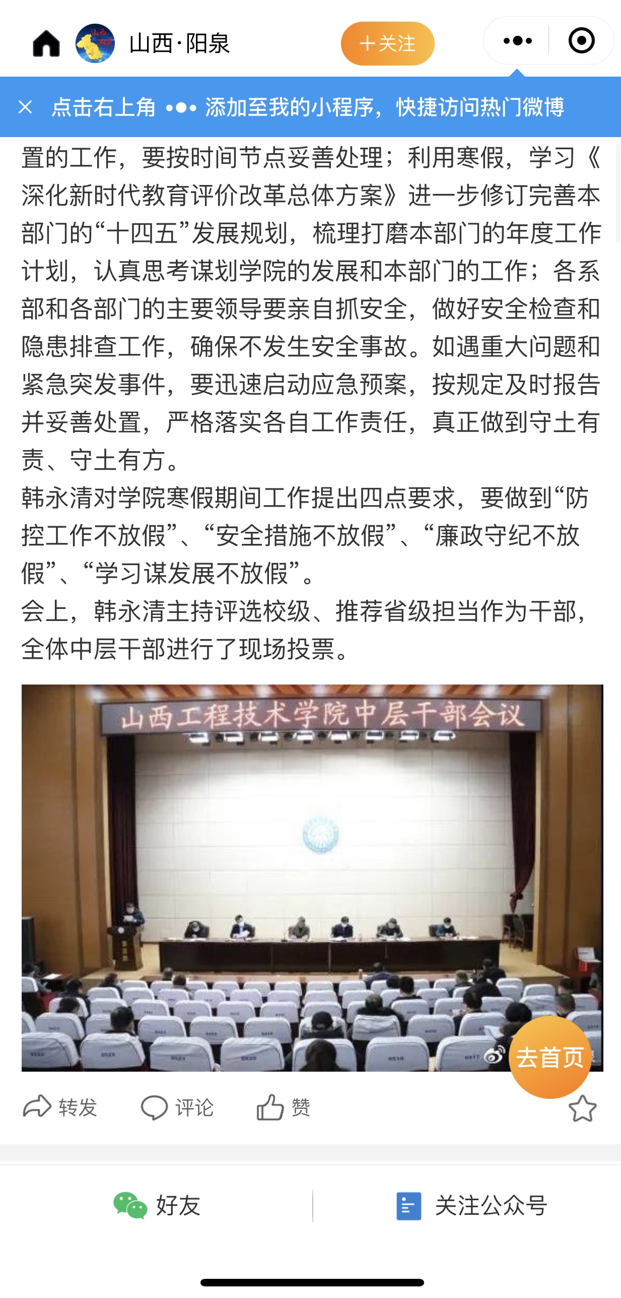 【媒体看山西工院】新浪微博1月17日报道ac米兰召开中层干部会议部署寒假工作