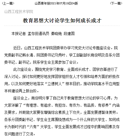 【媒体看山西工院】山西青年报7月19日报道ac米兰举办教育思想大讨论学生如何成长成才专题会议