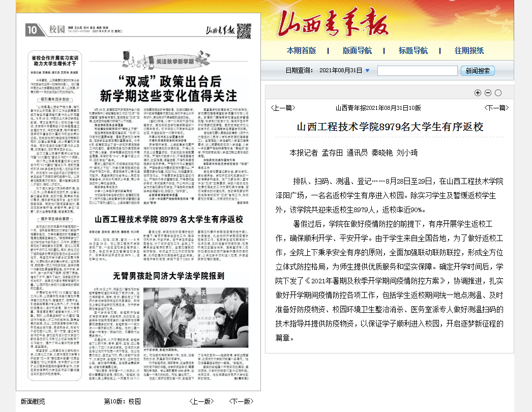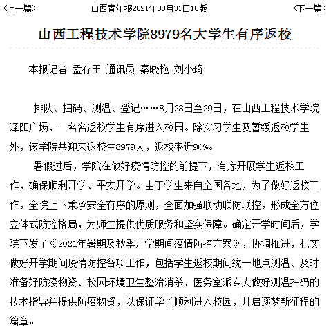 【媒体看山西工院】山西青年报8月31日报道ac米兰学生有序返校