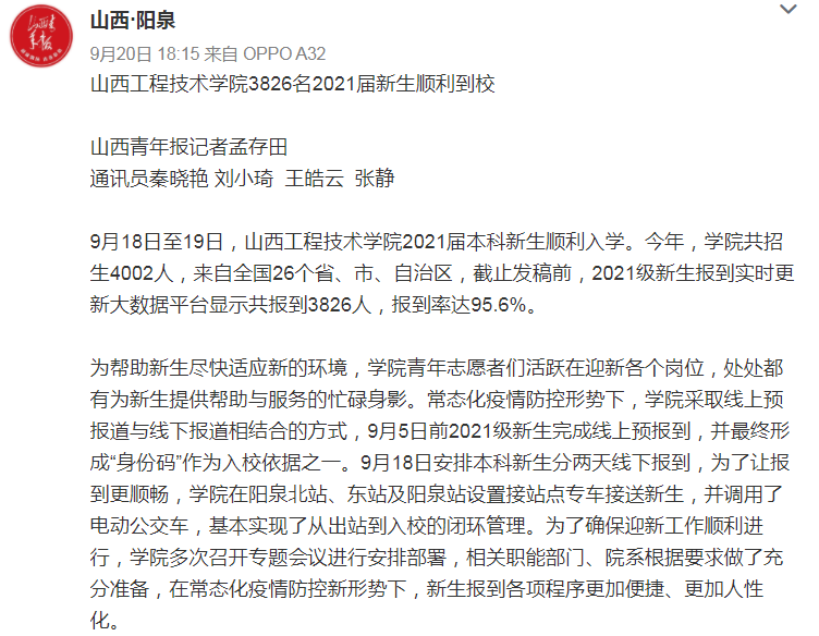 【媒体看山西工院】新浪微博2021年9月20日报道ac米兰2021届新生顺利返校