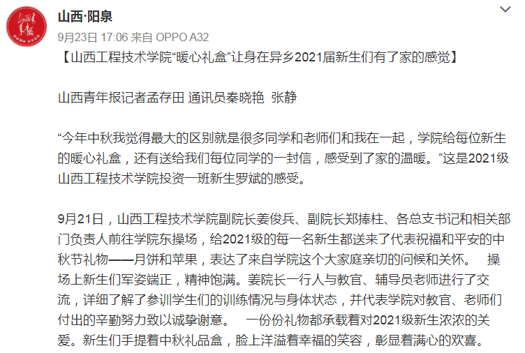 【媒体看山西工院】新浪微博2021年9月23日报道ac米兰“暖心礼盒”让身在异乡的2021届新生们有了家的感觉