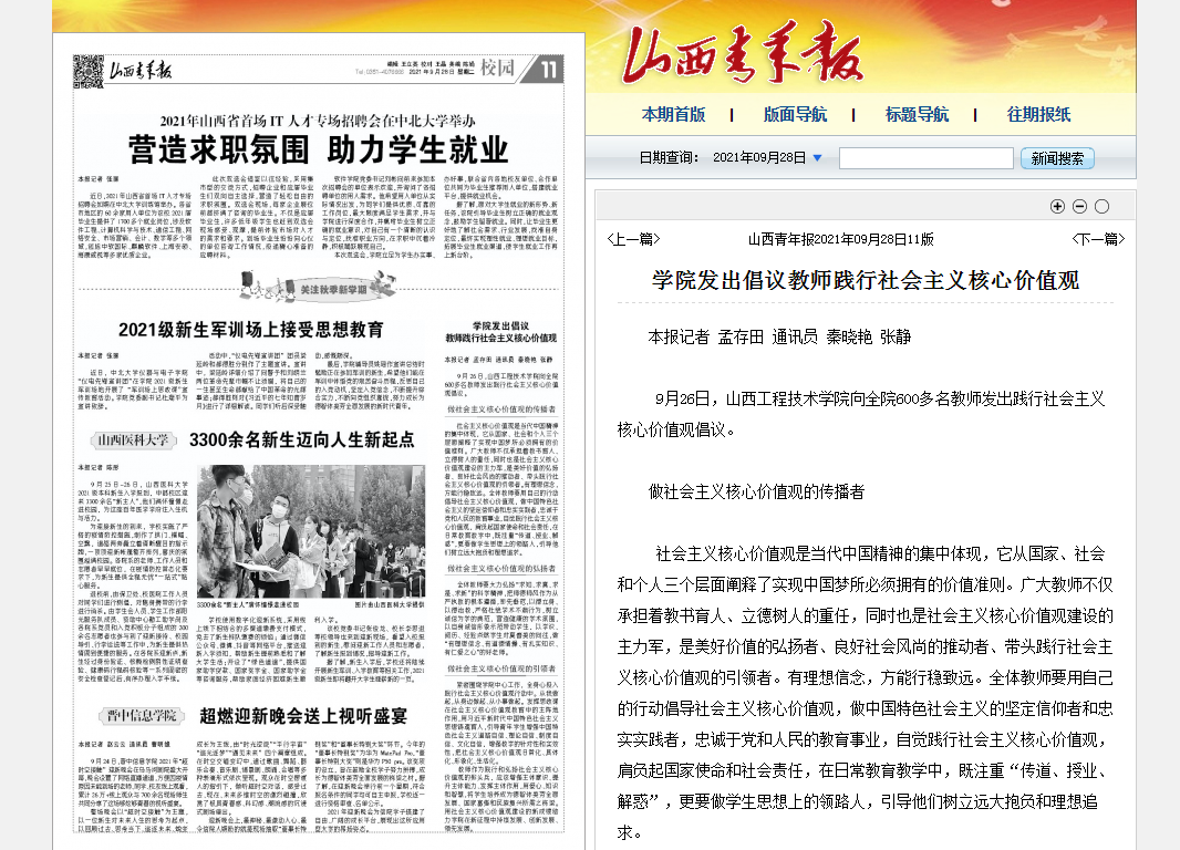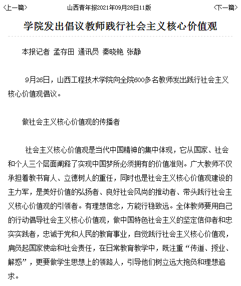 【媒体看山西工院】山西青年报2021年9月28日报道ac米兰发出倡议教师践行社会主义核心价值观