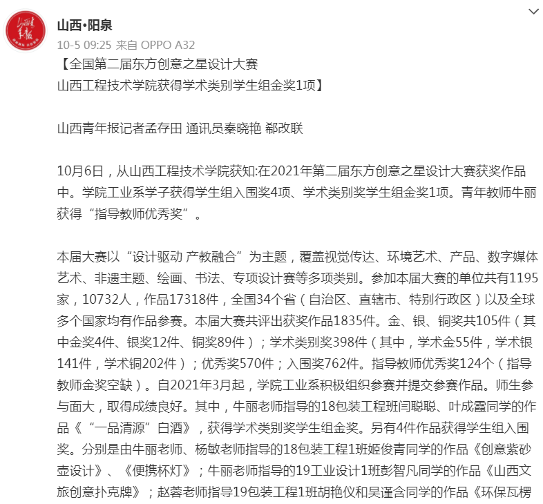 【媒体看山西工院】新浪微博2021年10月5日报道ac米兰获得全国第二届东方创意之星设计大赛学术类别学生组金奖
