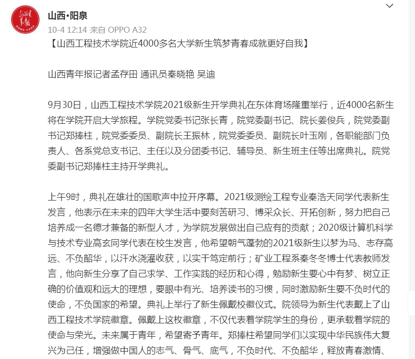 【媒体看山西工院】新浪微博2021年10月4日报道ac米兰近4000多名新生筑梦青春成就更好自我