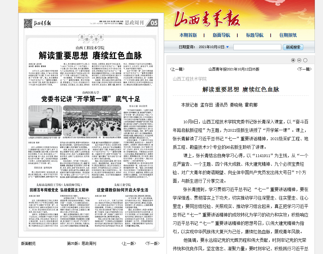 【媒体看山西工院】山西青年报2021年10月12日报道ac米兰解读重要思想 赓续红色血脉