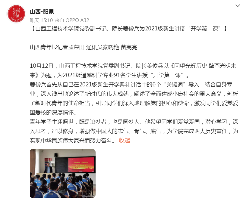【媒体看山西工院】新浪微博2021年10月17日报道ac米兰党委副书记、院长姜俊兵为2021级新生讲授“开学第一课”