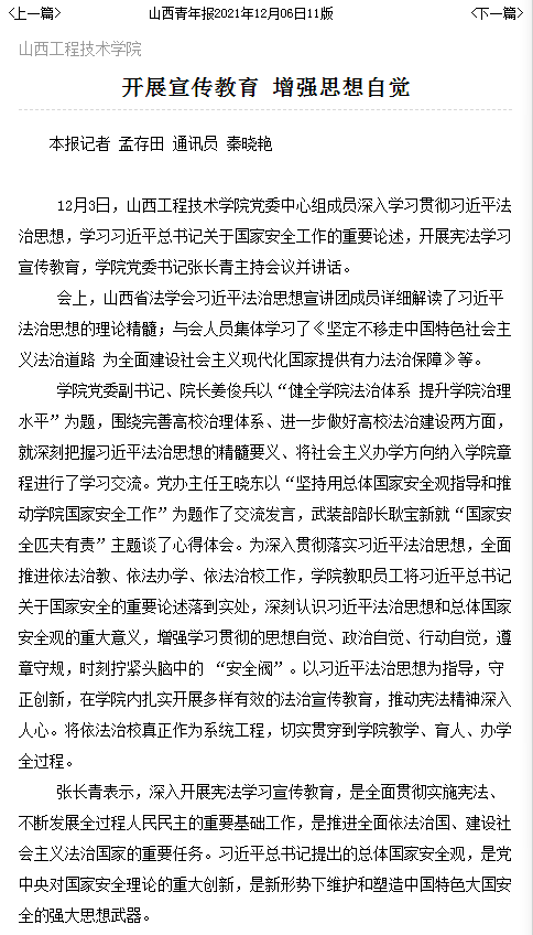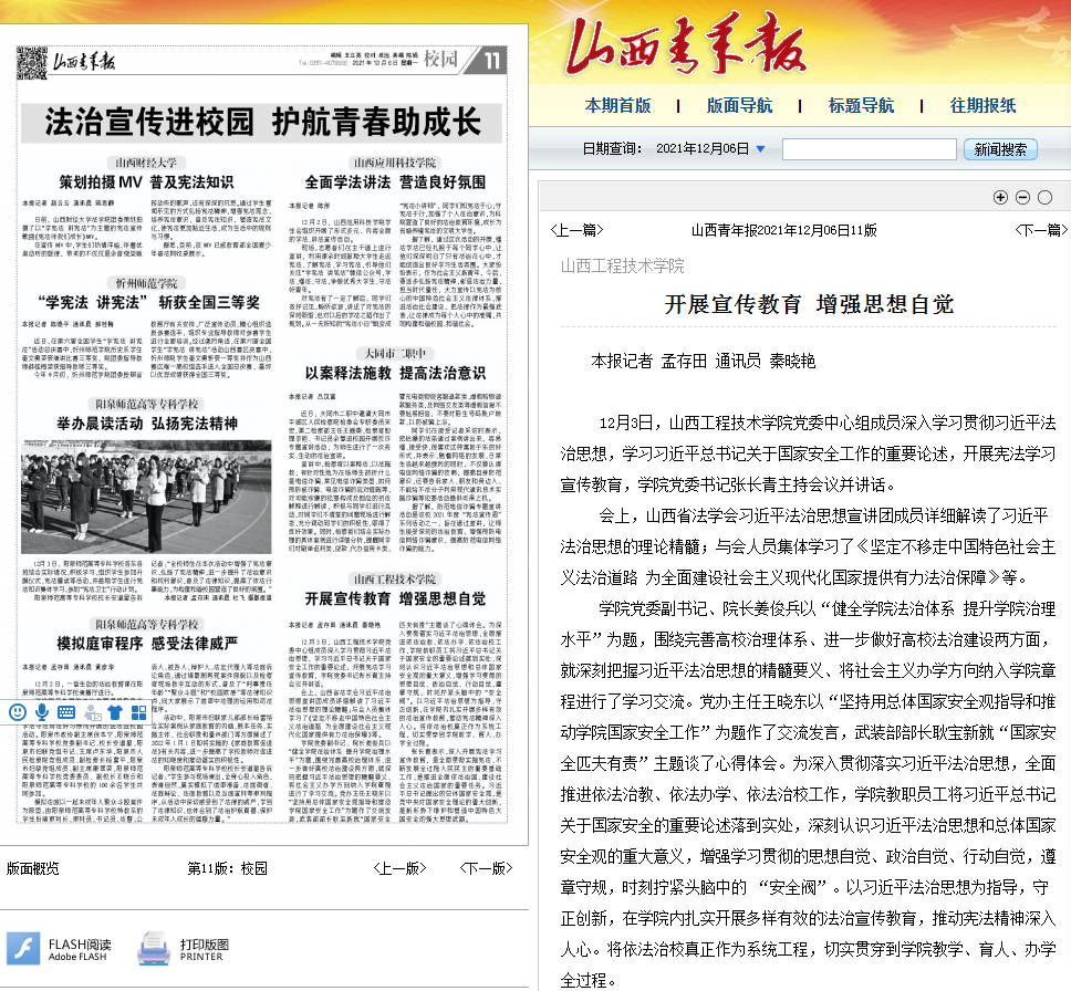 【媒体看山西工院】山西青年报2021年12月6日报道ac米兰开展法治宣传教育 增强思想自觉
