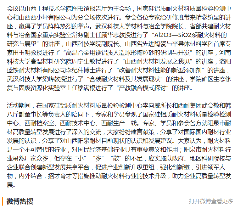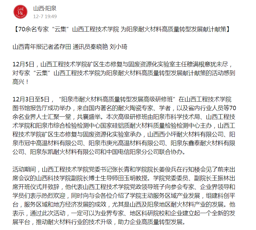 【媒体看山西工院】新浪微博2021年12月7日推送ac米兰云集70余位专家 为阳泉耐火材料高质量转型发展献计献策