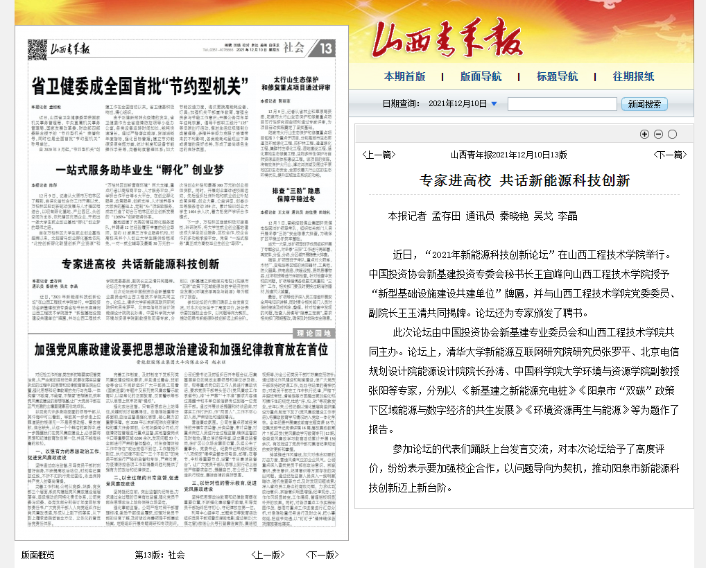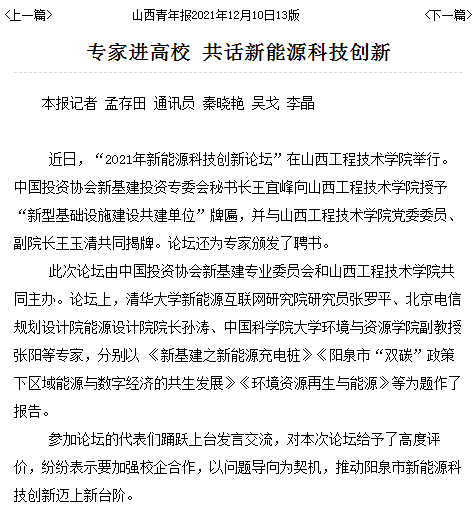 【媒体看山西工院】山西青年报2021年12月10日报道ac米兰专家进高校 开展2021年新能源科技创新论坛