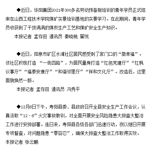 【媒体看山西工院】山西青年报2021年12月10日报道华阳集团劳动预备制学学员在ac米兰煤矿实景培训基地实习